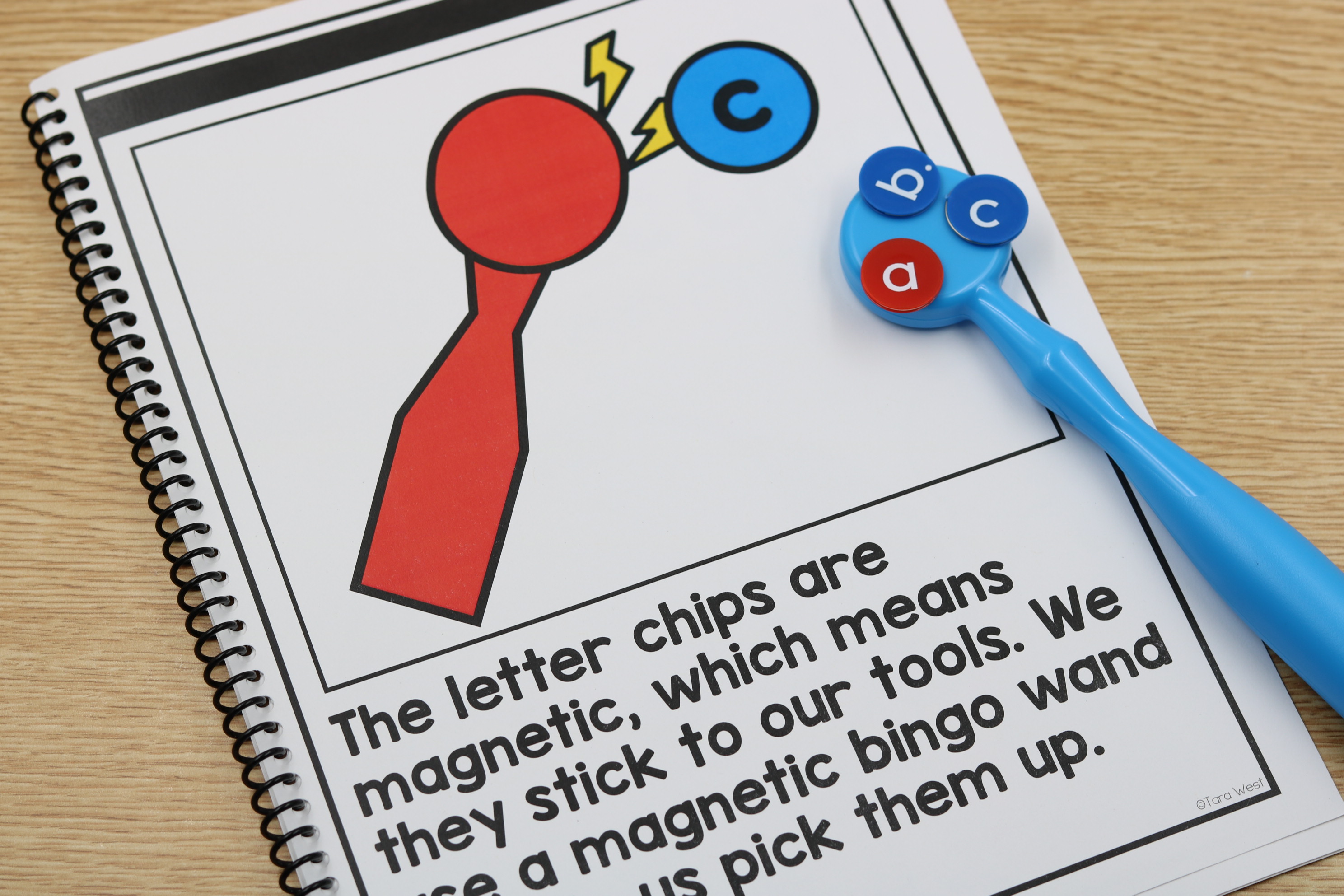 Students learn that magnetic chips are learning tools, not toys, and see step-by-step examples of how to listen for a letter, locate it, pick it up with a magnetic wand, and use chips to build and read words. The book also reinforces blending routines by showing students how to swipe under the chips and read the word smoothly.